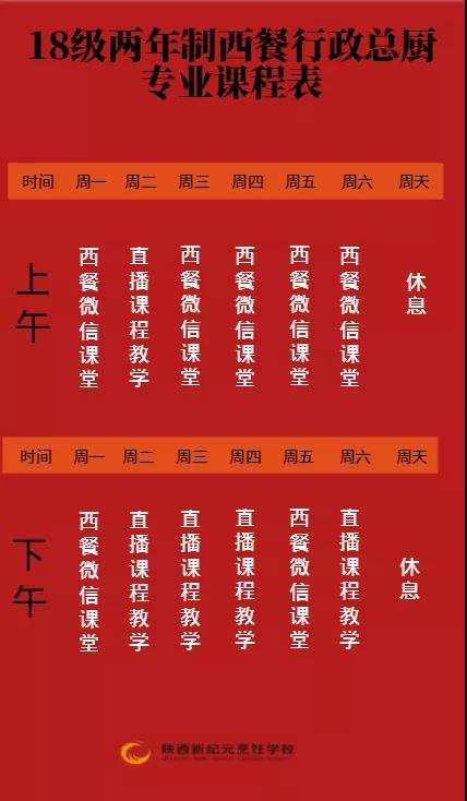 按照日前我市人社局通知要求,为切实服务和保障防控疫情期间职业教育“停课不停教、不停学”,陕西新纪元烹饪学校结合实际情况安排部署了防控疫情期间我校师生“停课不停学”的各项工作,并要求于即日起,正式发布线上课堂直播课程表、播出平台、播出时间等信息,望所有学子能够准时在线进行所在专业课程的在线学习!
