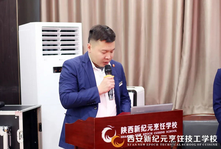 西安新纪元烹饪技工学校教务处宋副处长担任本次职称评定受聘仪式的主持人,隆重介绍本次仪式的与会领导: