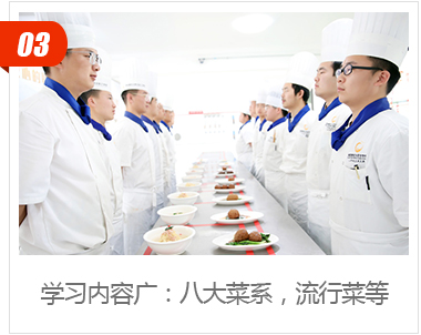 学习中国传统八大菜系(川鲁苏粤徽湘闽浙),并包含了时尚西餐、中西式面点的制作流程。